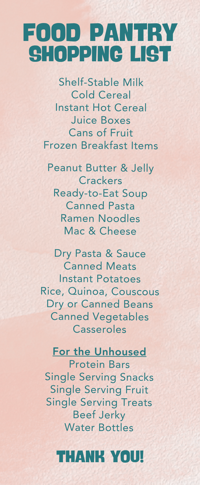 2. Donate casseroles and/or items from our regular Food Pantry Family Bag shopping list (below).
